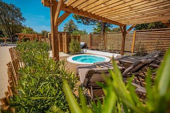 L’espace bien-être réservé aux adultes complète l’offre avec un jacuzzi 8 places et un sauna. Les transats et pergolas en bois bordent le bassin, dans une ambiance végétale palmiers-bambous. Des séances d’aquagym et d’aquabike encadrées par l’équipe rythment la haute saison.