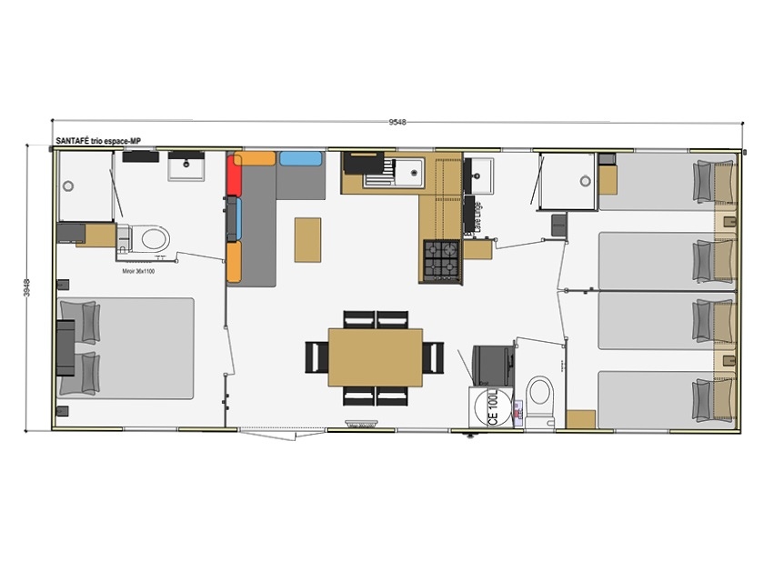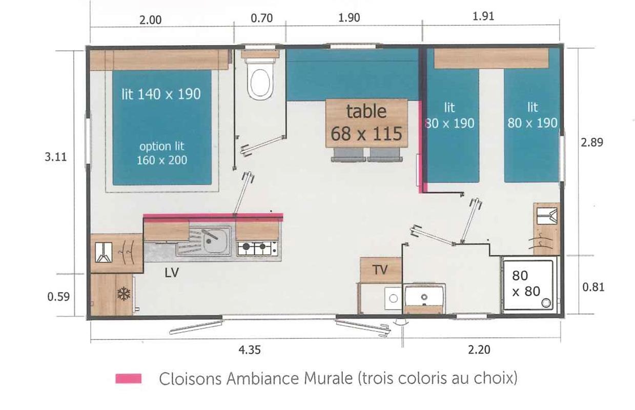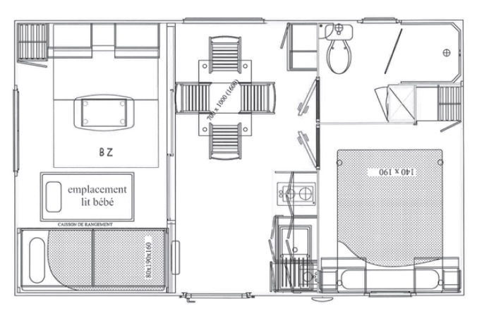 - Une chambre avec lit 140, 2 lits 80 superposés et banquette BZ avec cloison modulable pouvant séparée la chambre