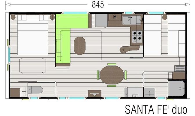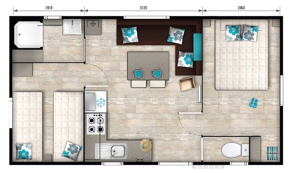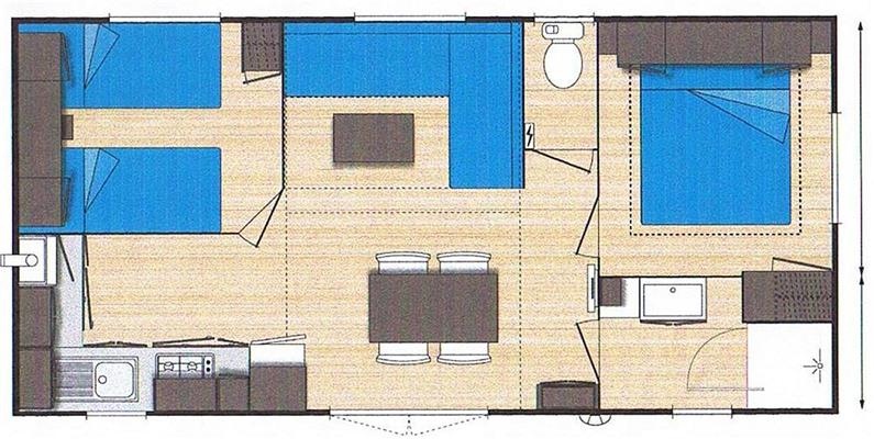 - Salle principale avec salon, table basse et lit tiroir pour 2 couchages et coin repas séparé